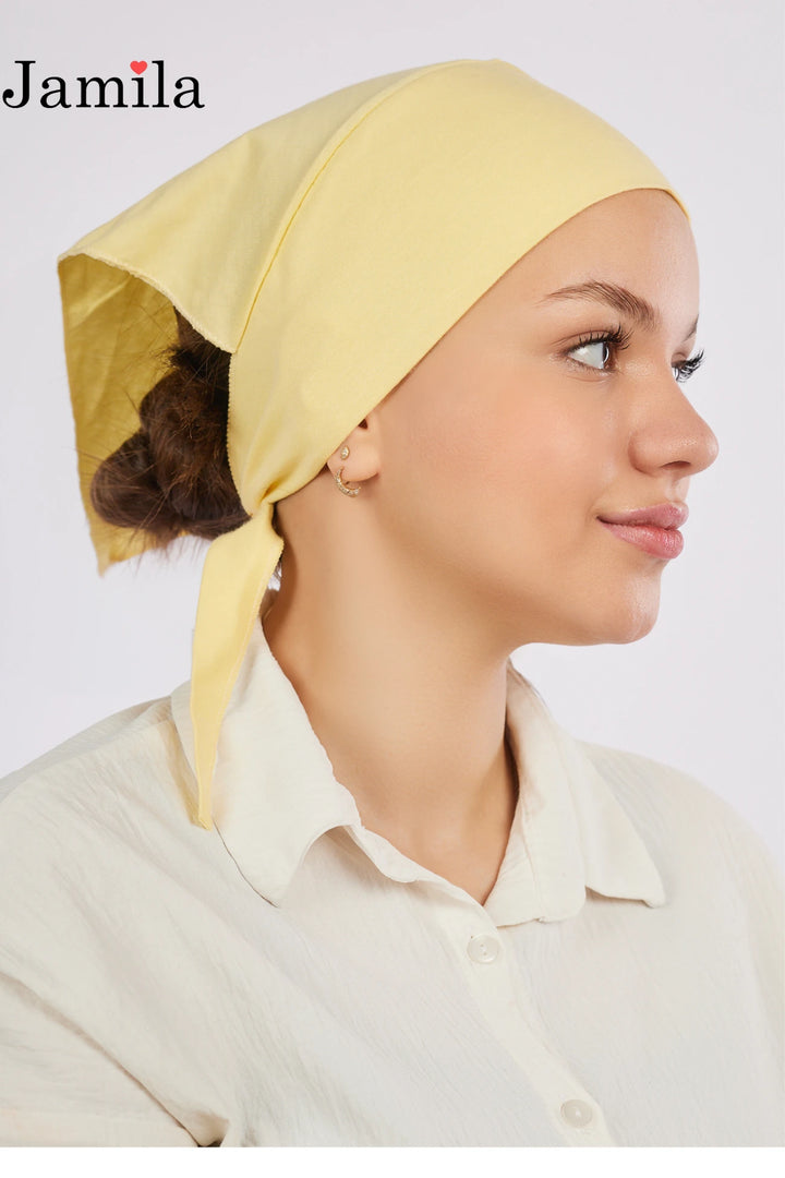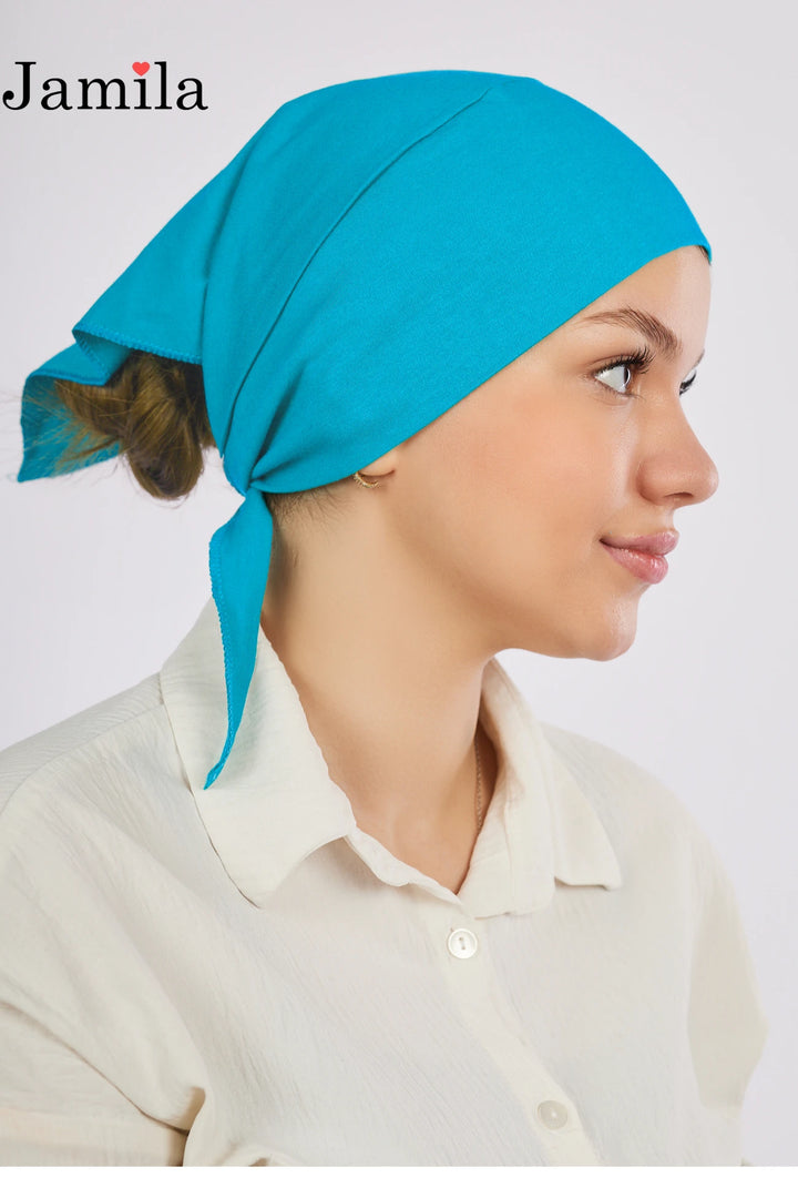 Jamila brand bandana with a triangular tie at the end, offering two loops for wrapping around the head. This bandana is seamless and adds no bulk to the front when worn. Made from 100% Egyptian cotton.