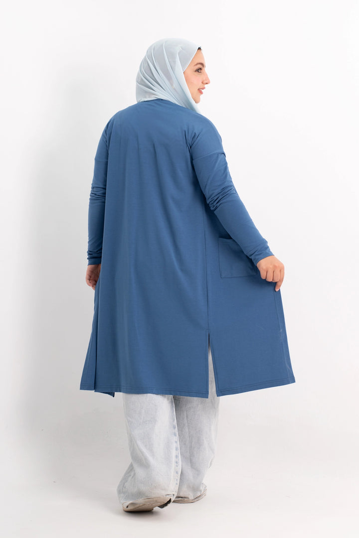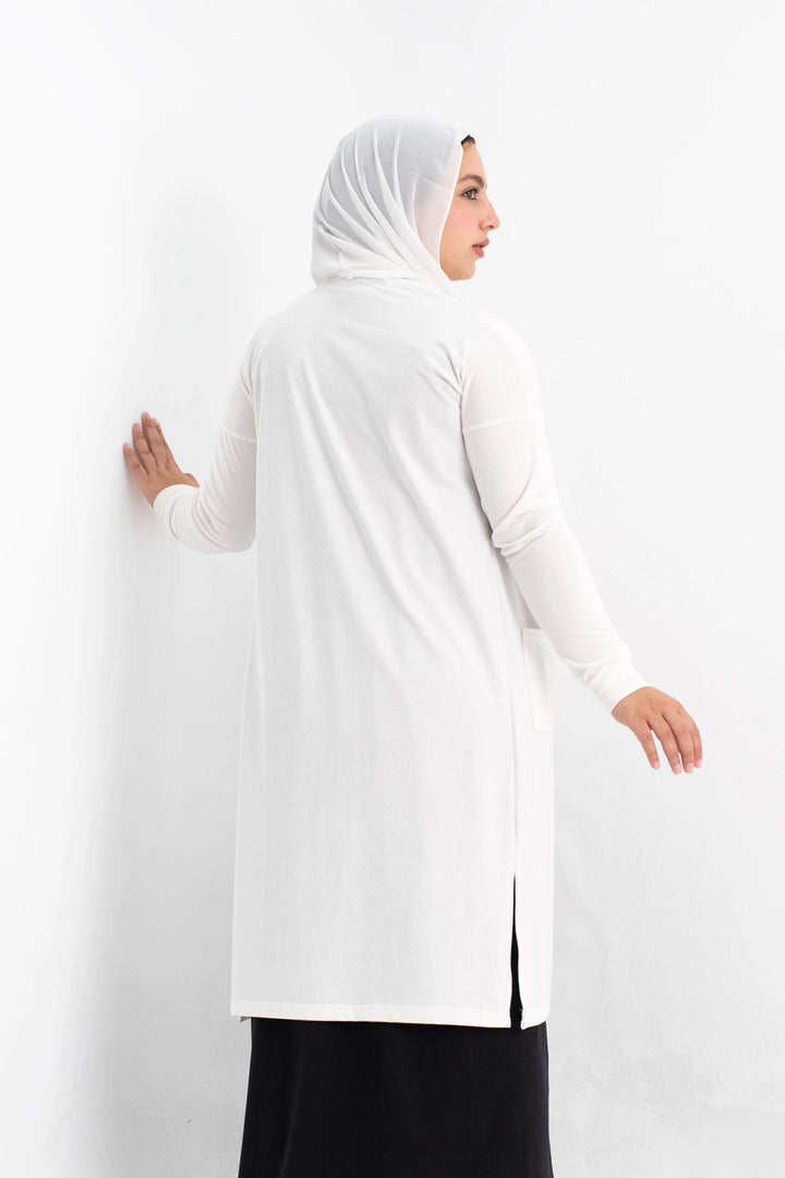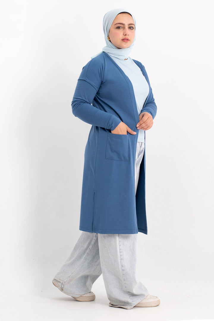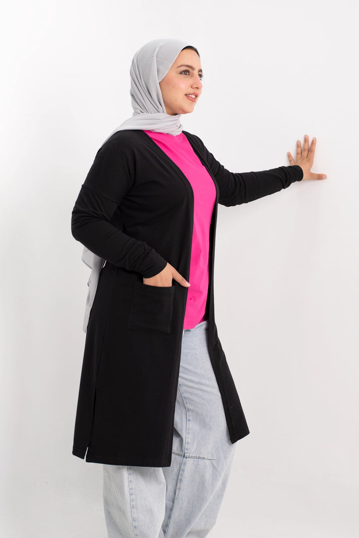 Its practical design, with long sleeves, cuffs, side slits, and front pockets, makes it ideal for any everyday outing.