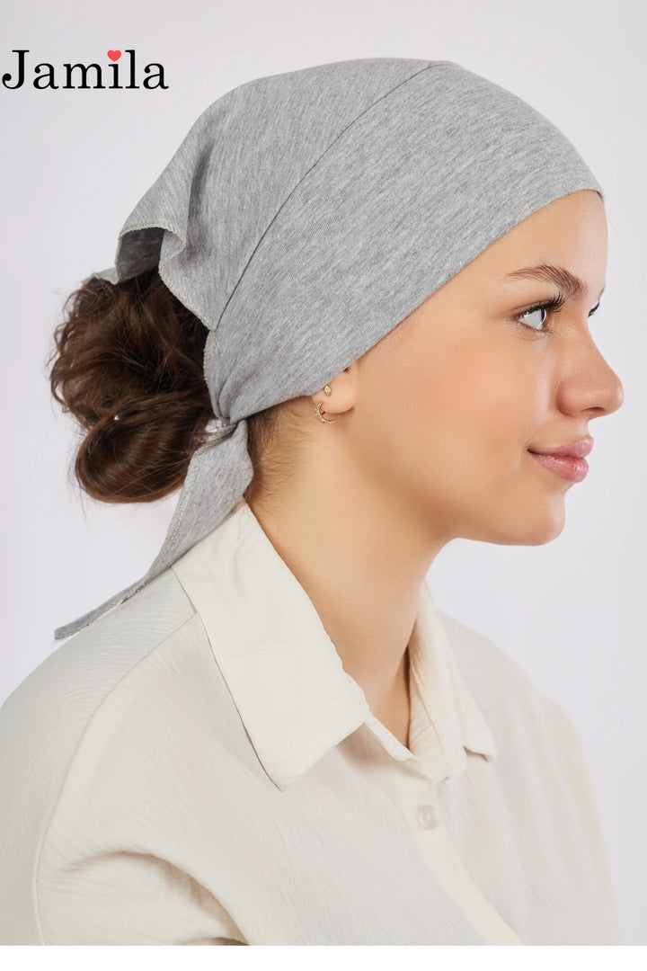 بندانة ماركة Jamila برباط ذو نهاية مثلثة لها طرفين للربط حول الرأس. هذه البندانة لا تعطي اي سُمك من الامام عند ارتداءها. مصنوعة من القطن المصري 100%.