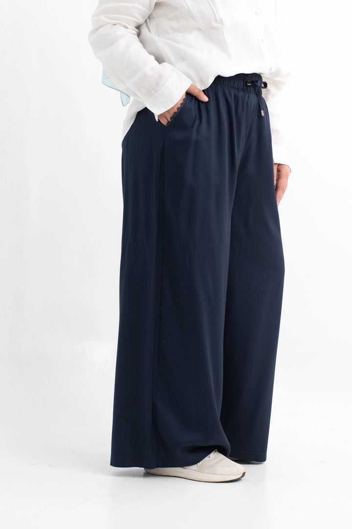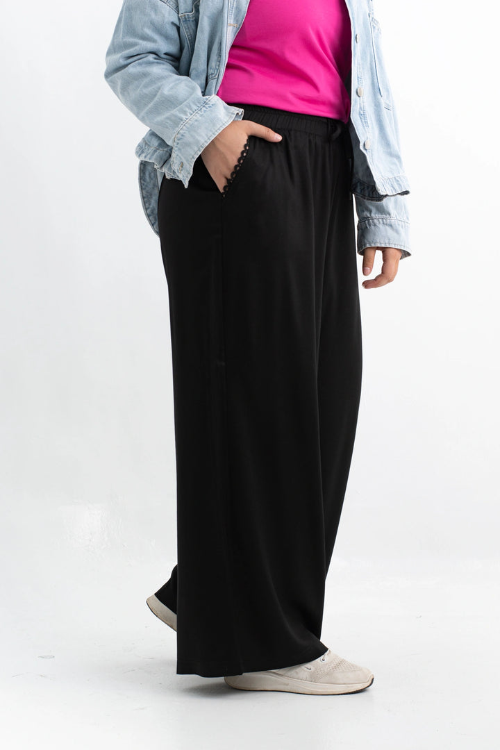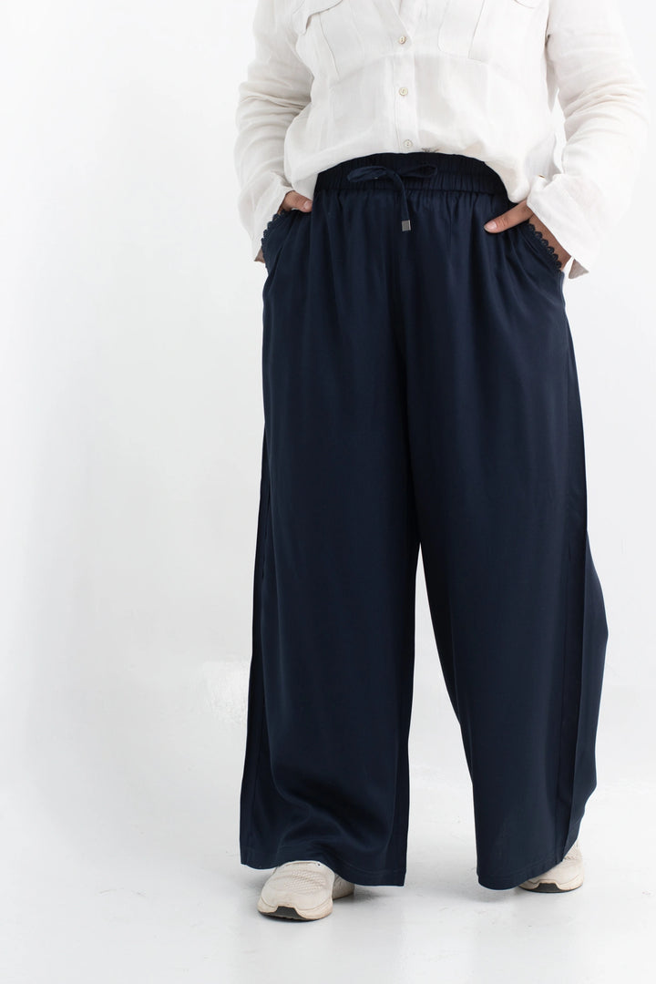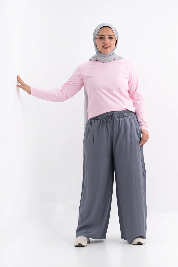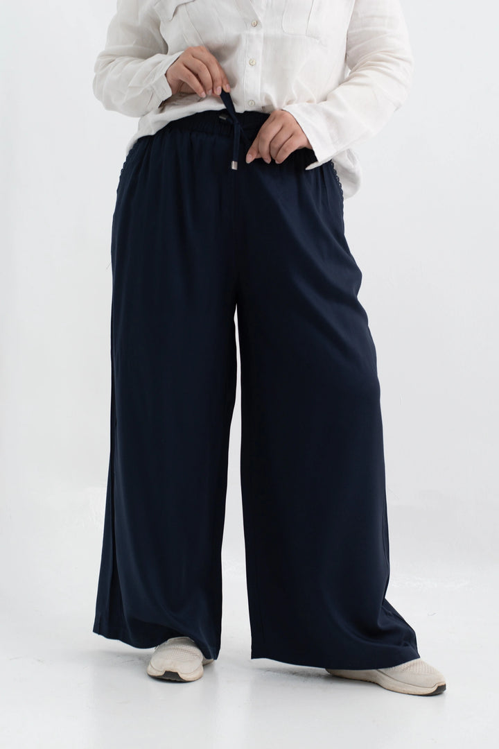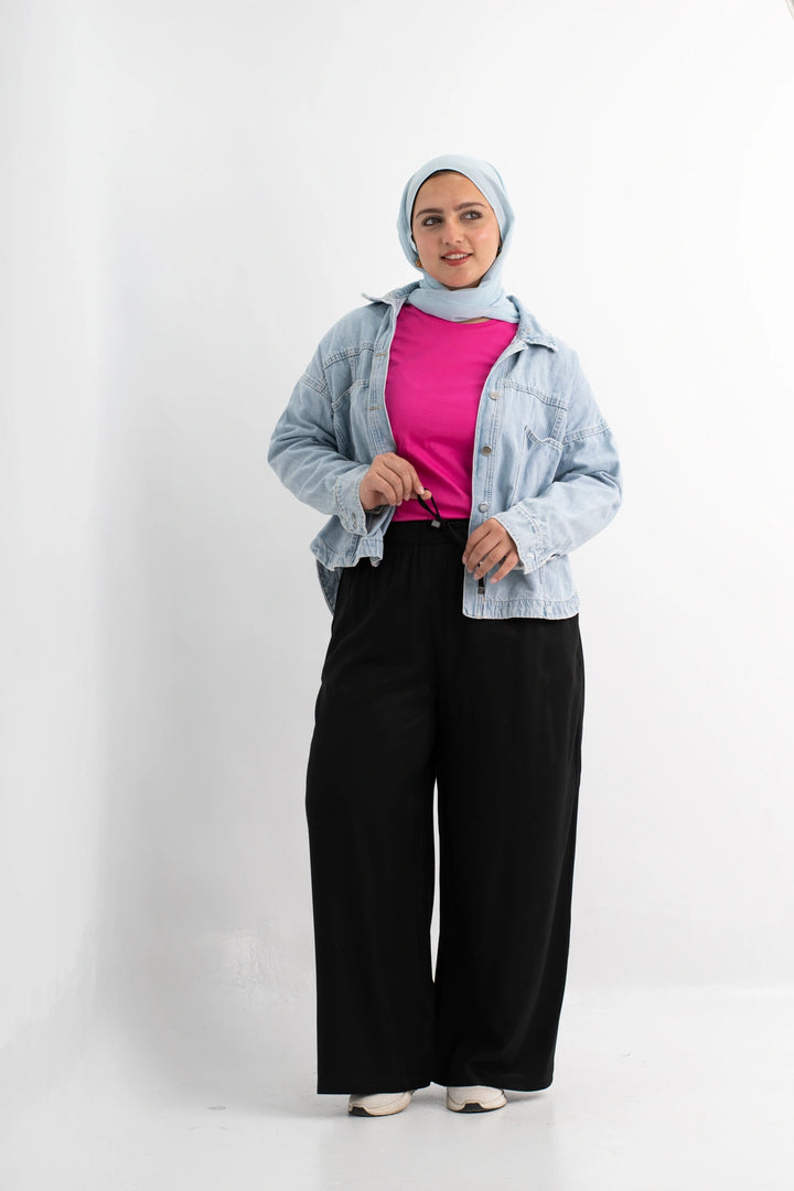 بنطلون وايد ليج به جايبين عليهم شريط من الجوبير والوسط استيك خامته ناعمه انسيابيه مناسبه للصيف