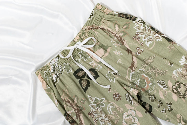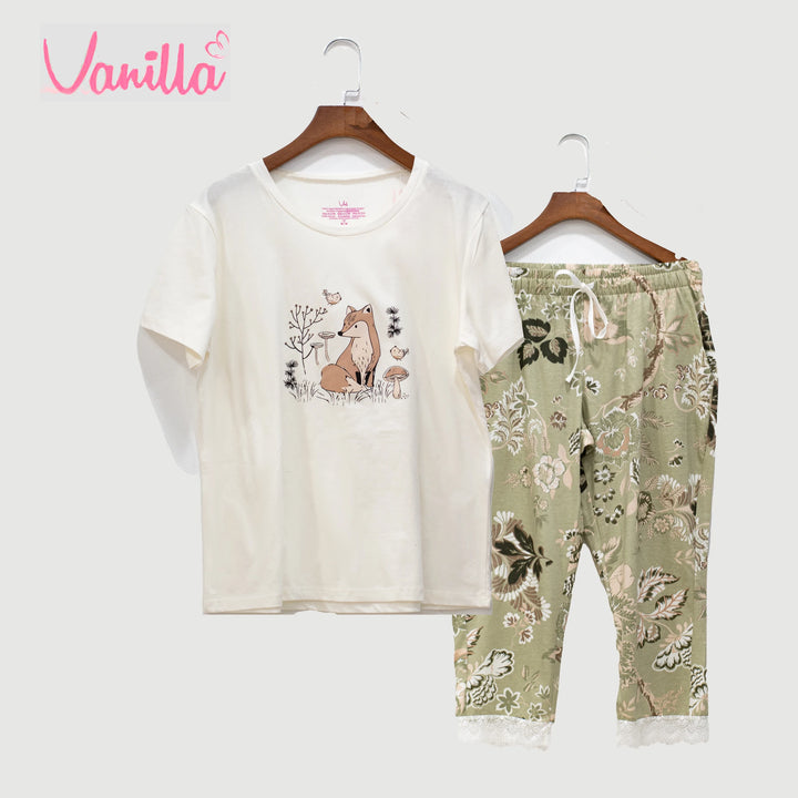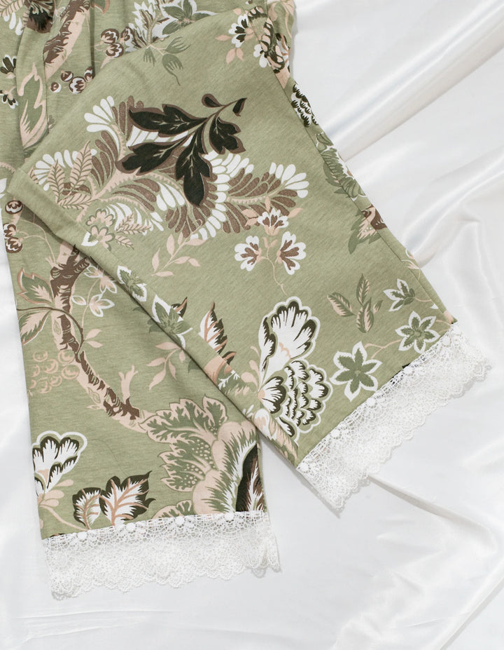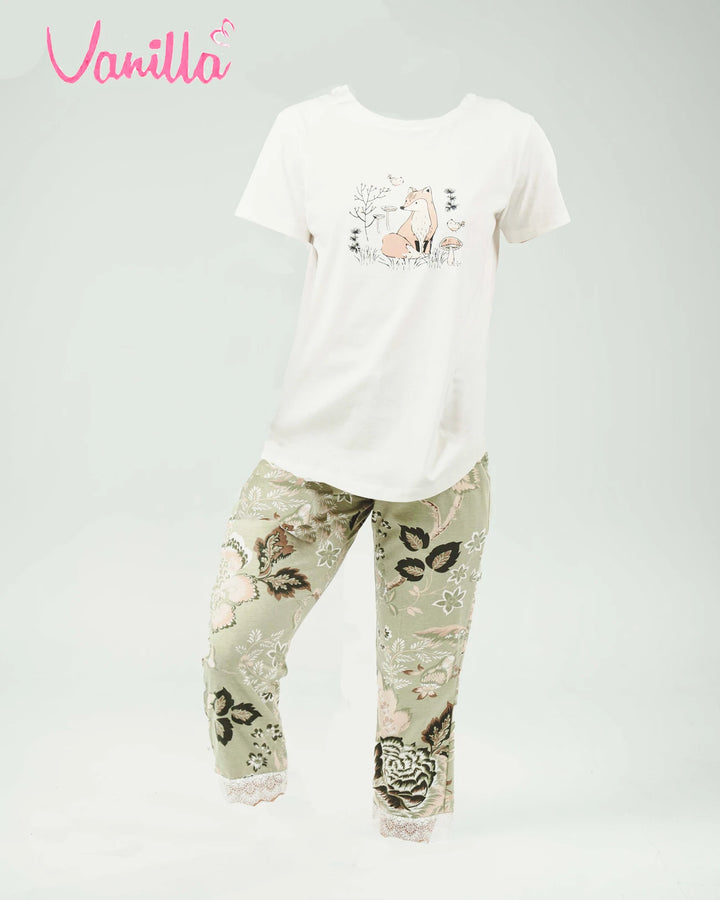 بيجامه بنتاكور قطن التوب نصف كم وعليه طباعه والبنتاكور في نهايته شريط دانتيل وبه جايبين علي الجناب