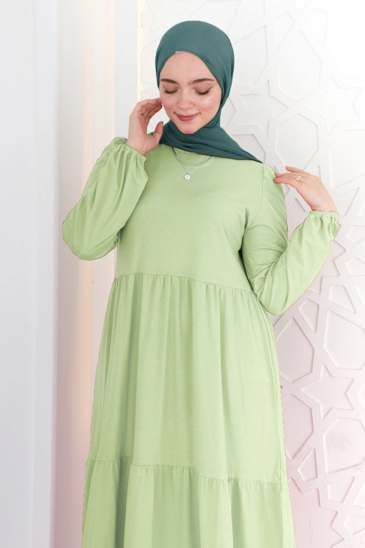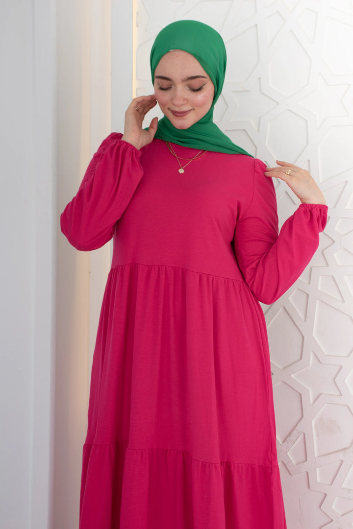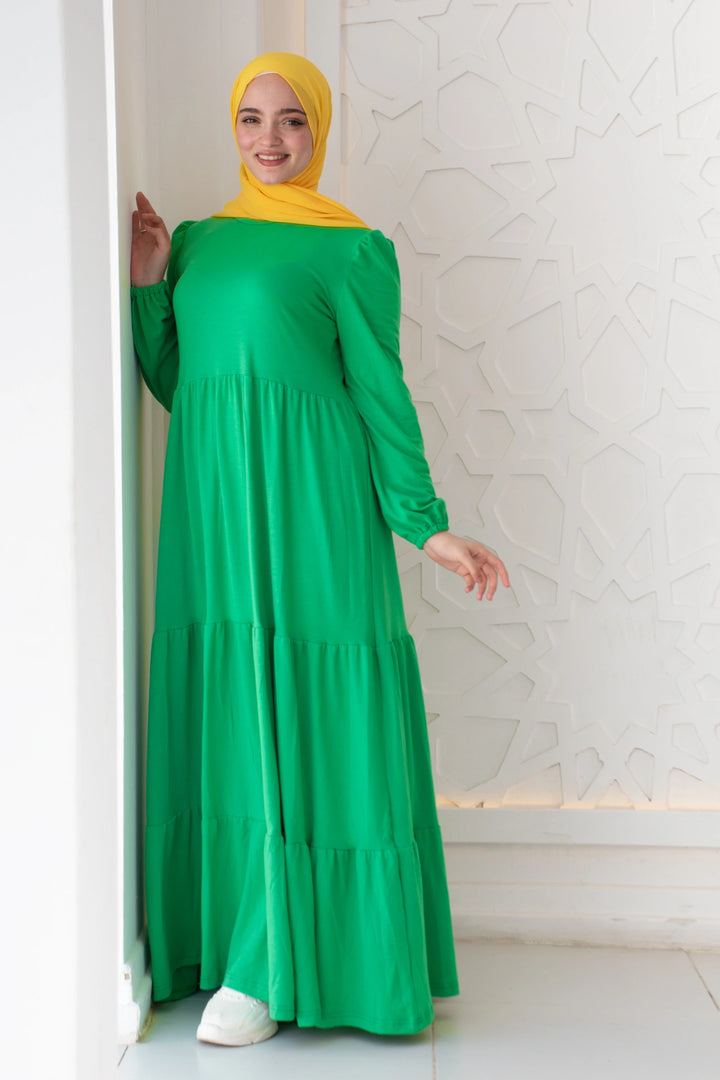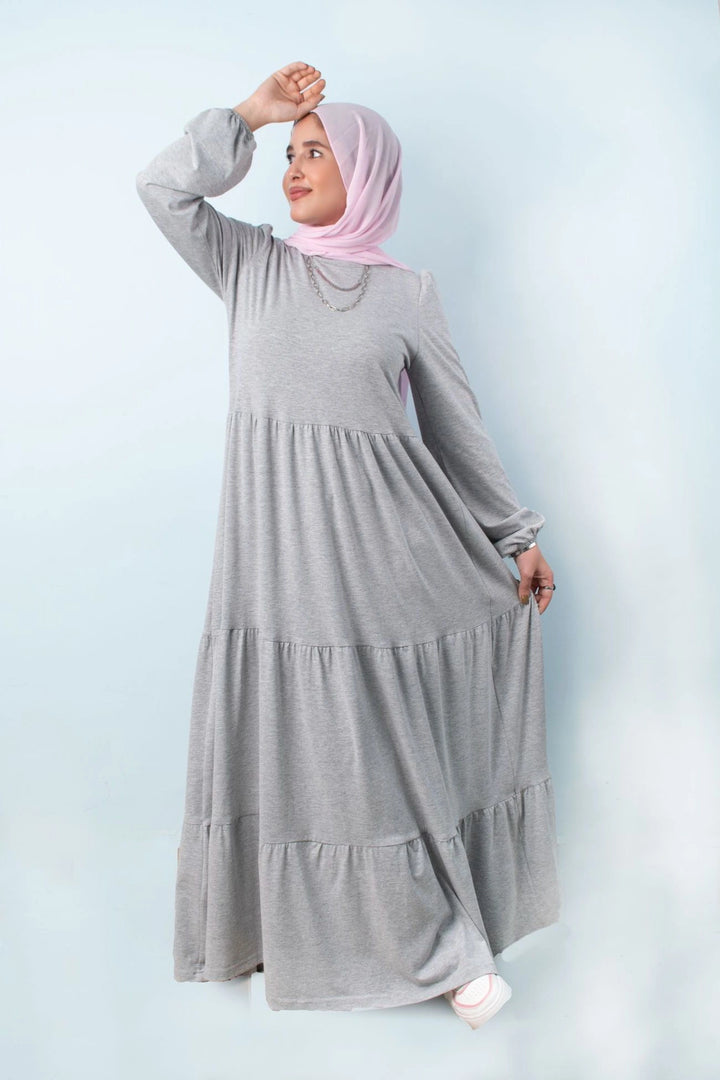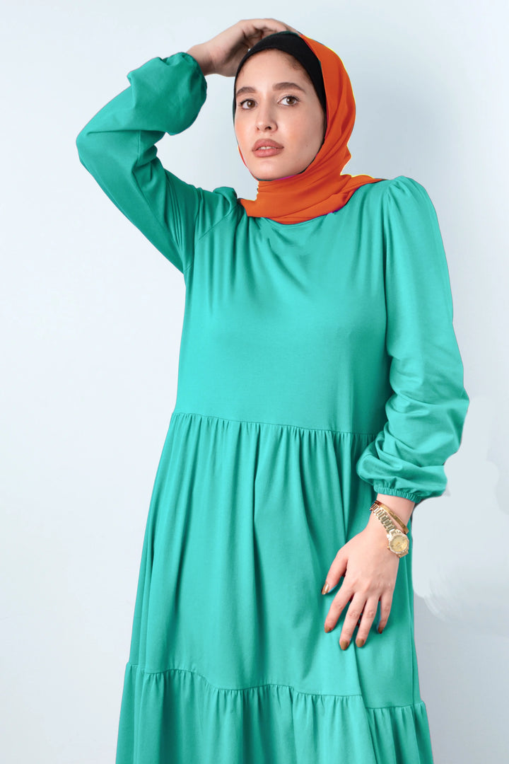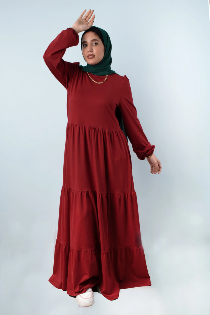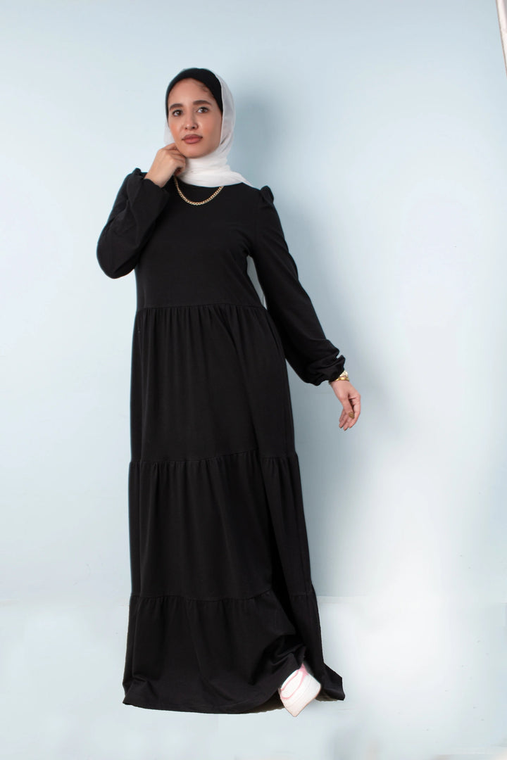 فستان طبقات 65% قطن 35% ليكرا كم طويل في نهاية الكم استيك. قصة واسعة غير ملاصق للجسم.