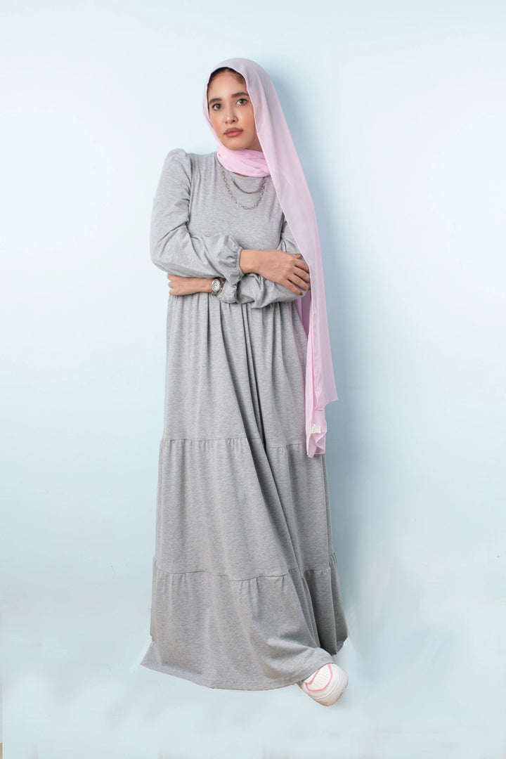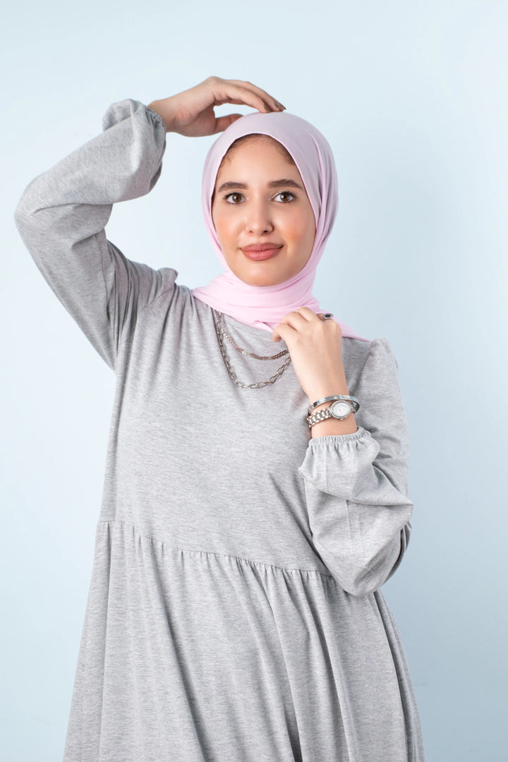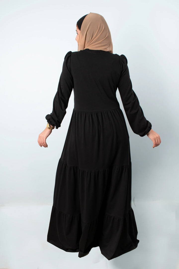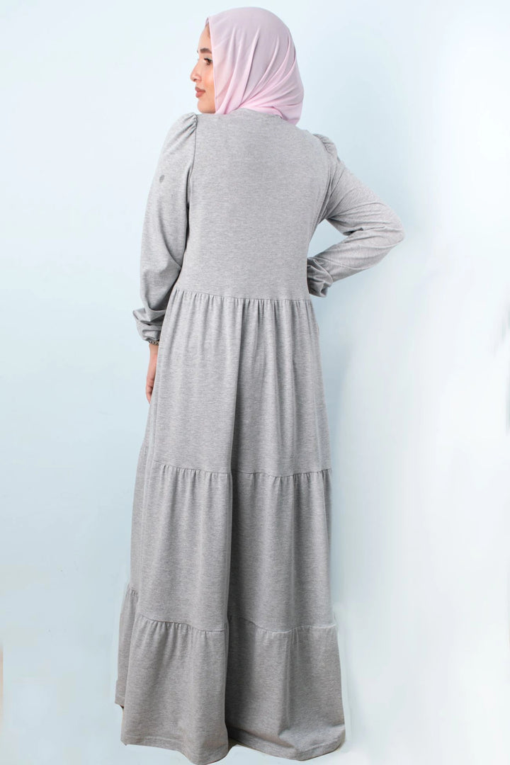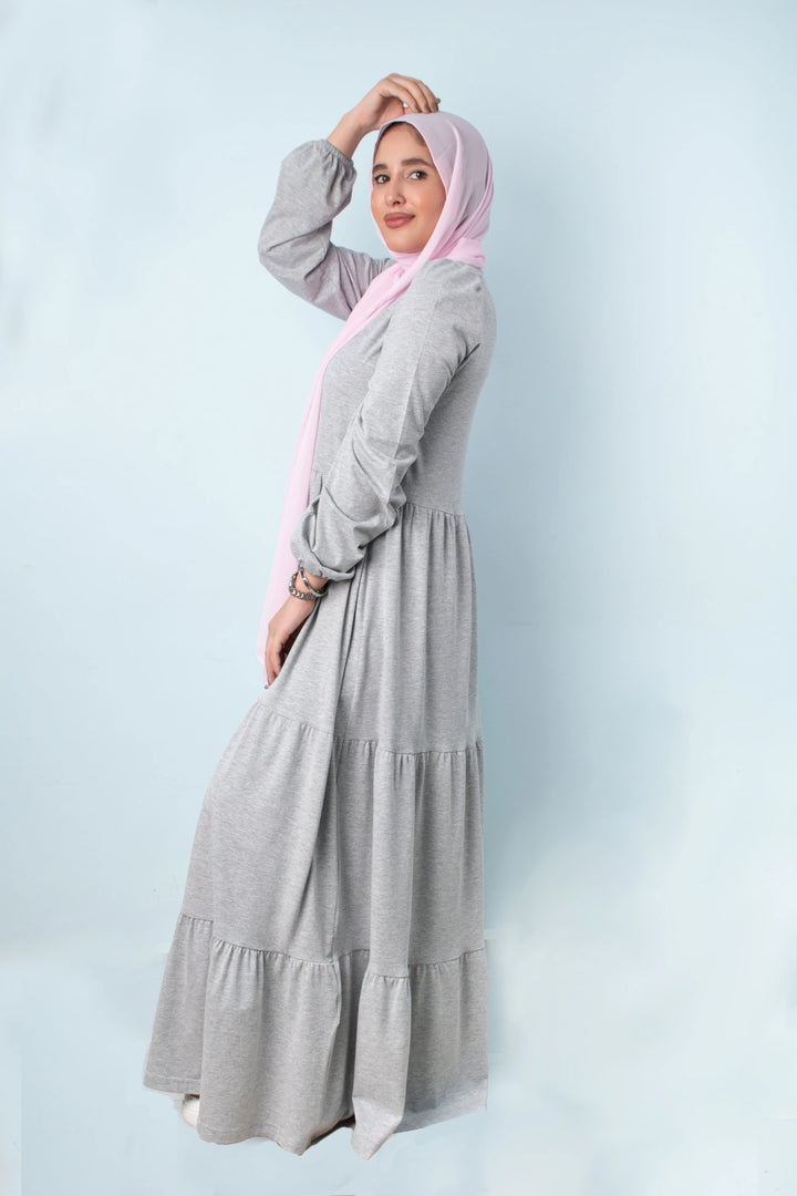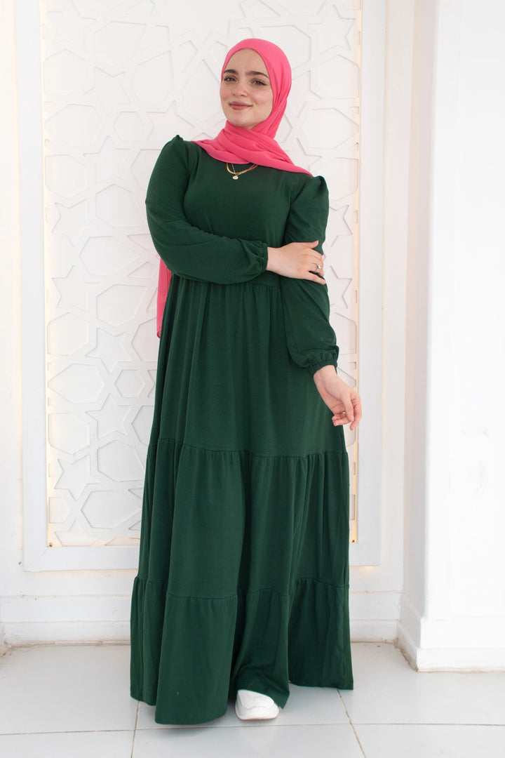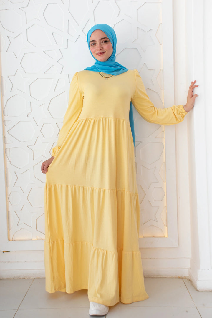 فستان طبقات 65% قطن 35% ليكرا كم طويل في نهاية الكم استيك. قصة واسعة غير ملاصق للجسم.