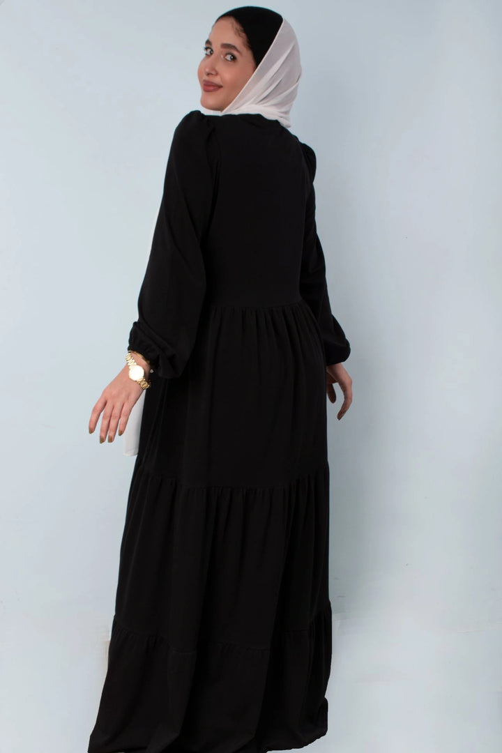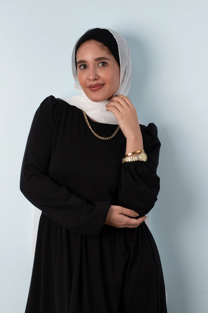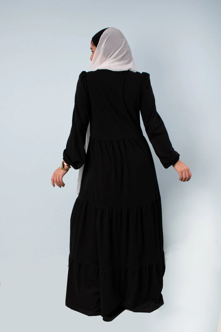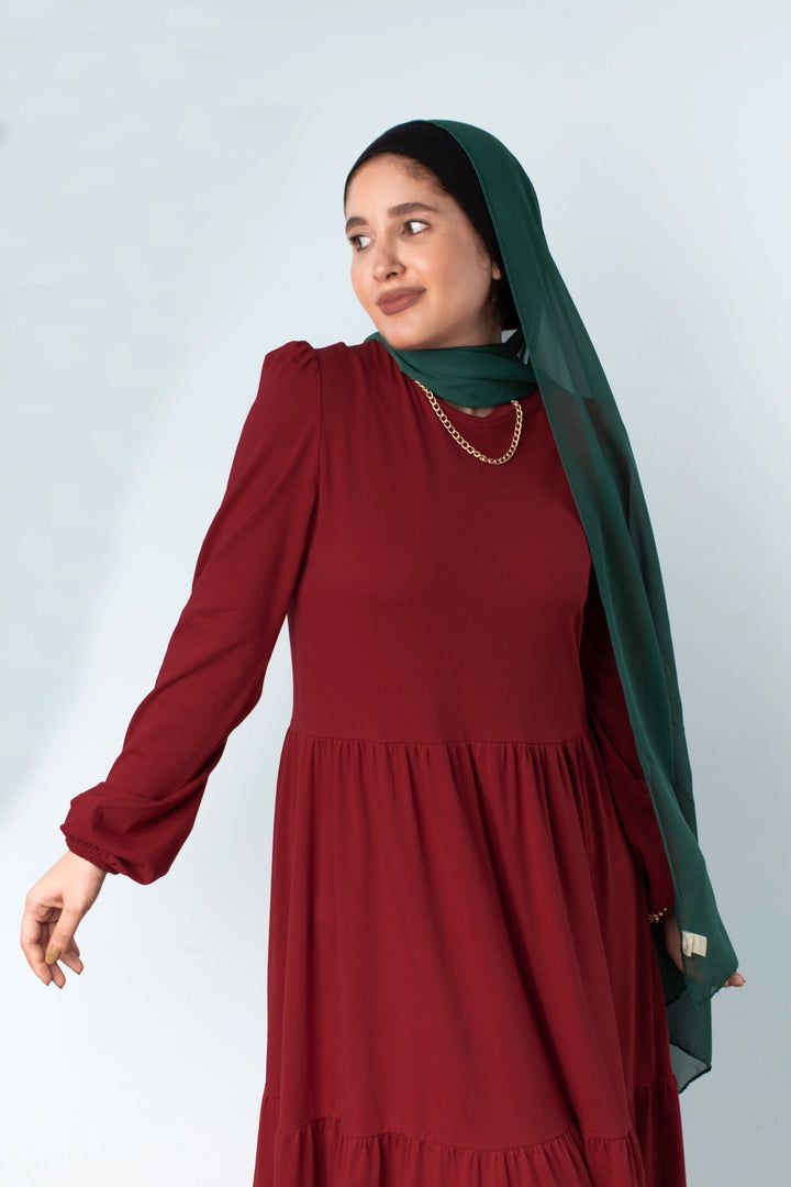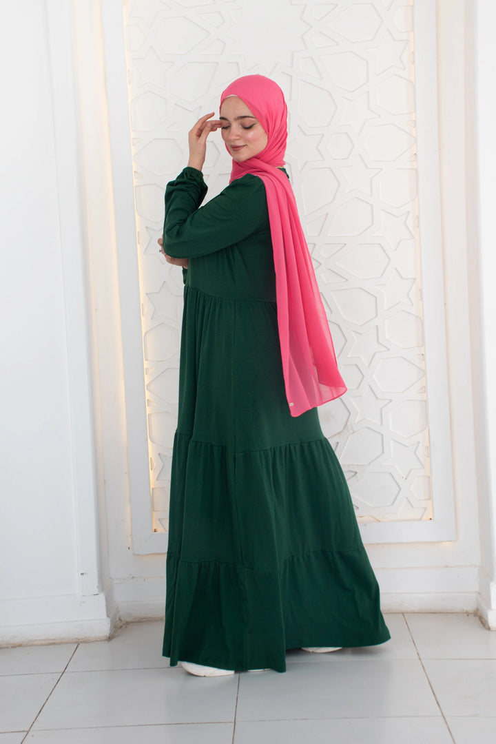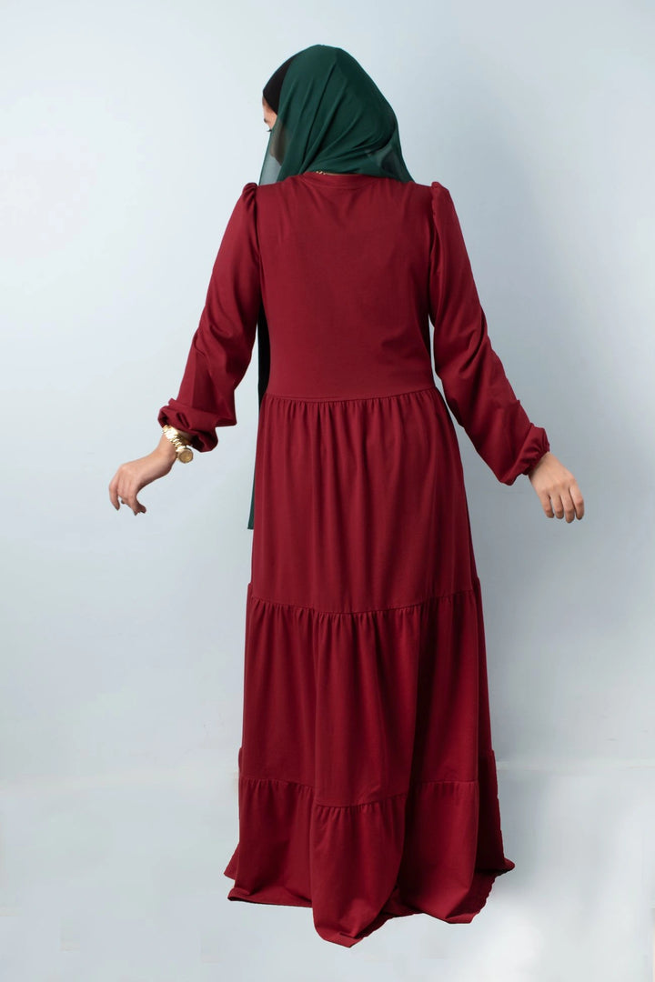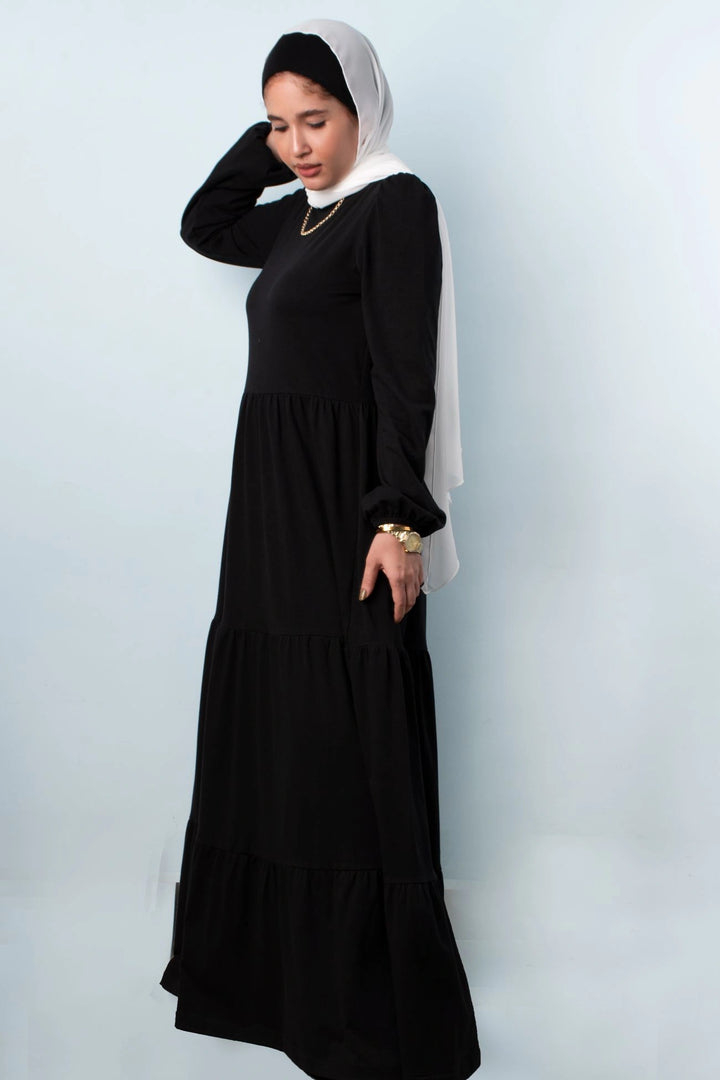 فستان طبقات 65% قطن 35% ليكرا كم طويل في نهاية الكم استيك. قصة واسعة غير ملاصق للجسم.