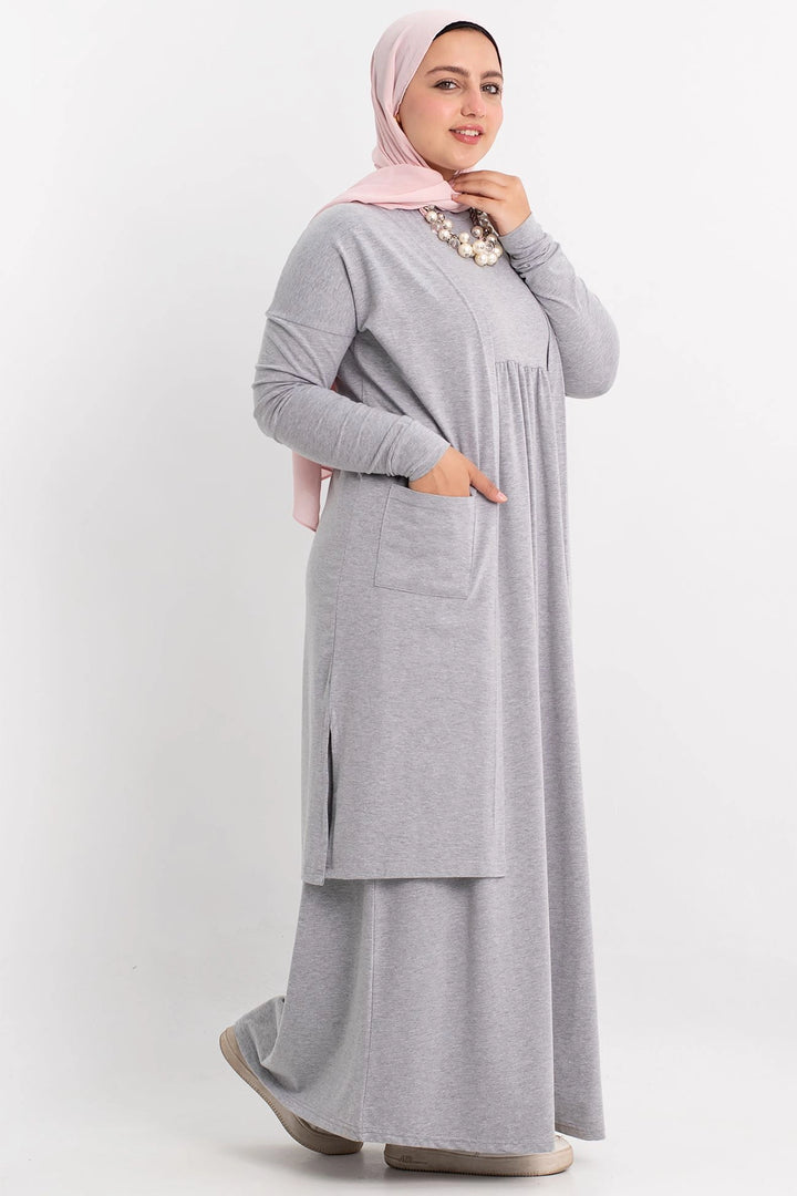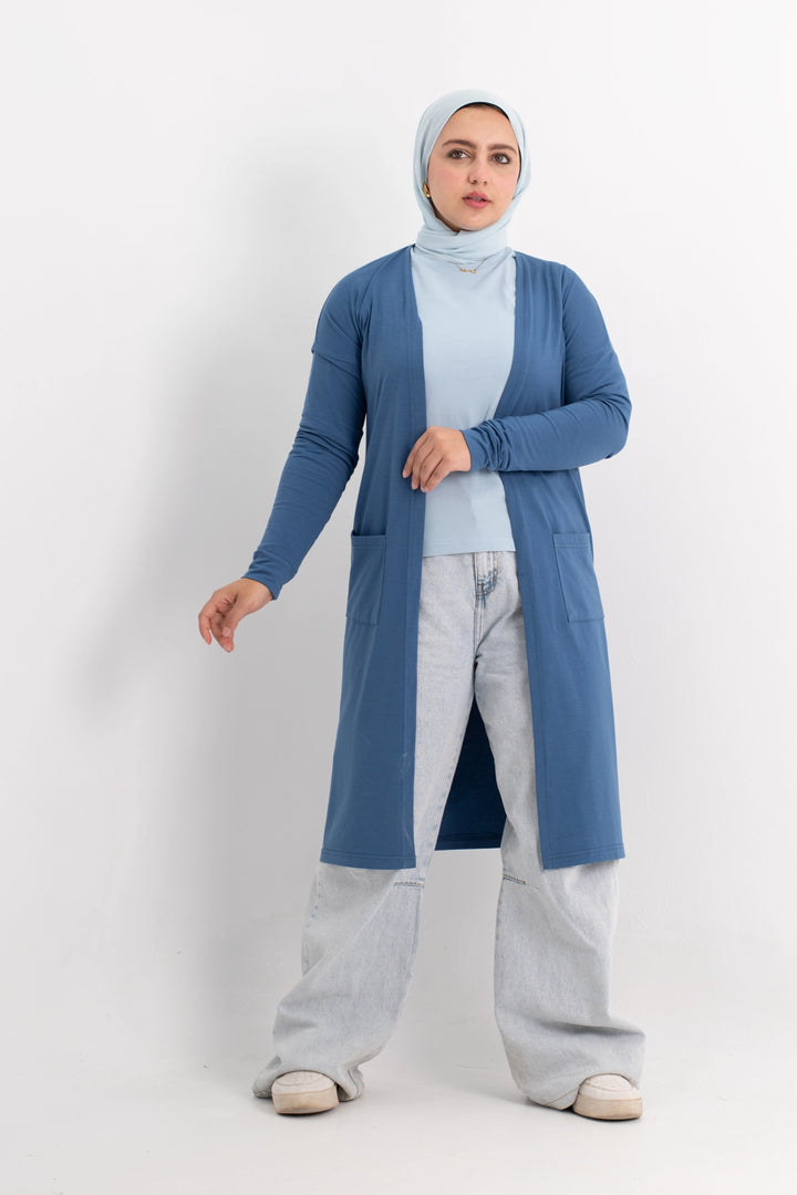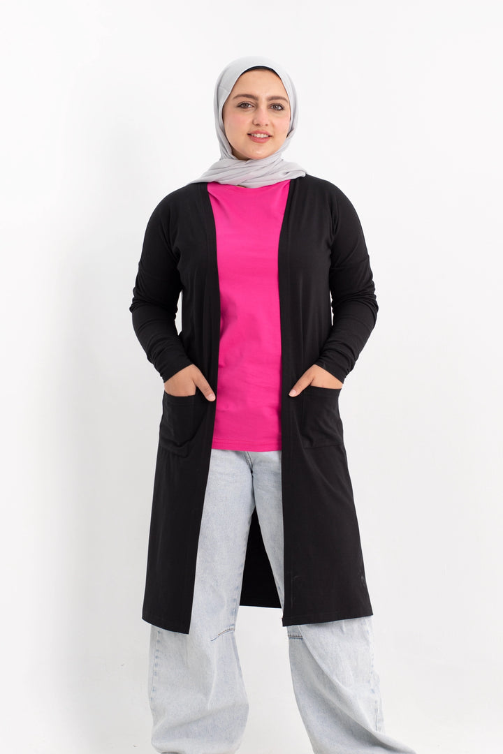 كاردجان طويل قطن كم طويل في نهايته اسوره وفي فاتحتين علي الجوانب وبه جايبين خامته قطن به نسبه ليكرا خفيفه