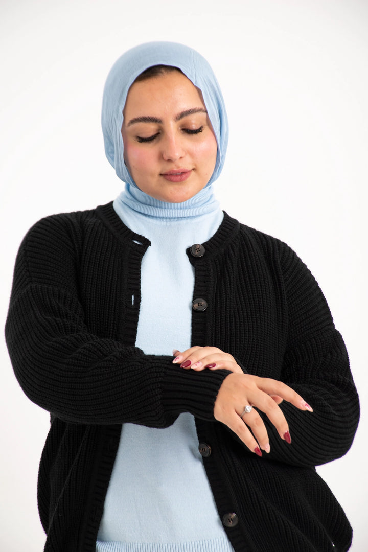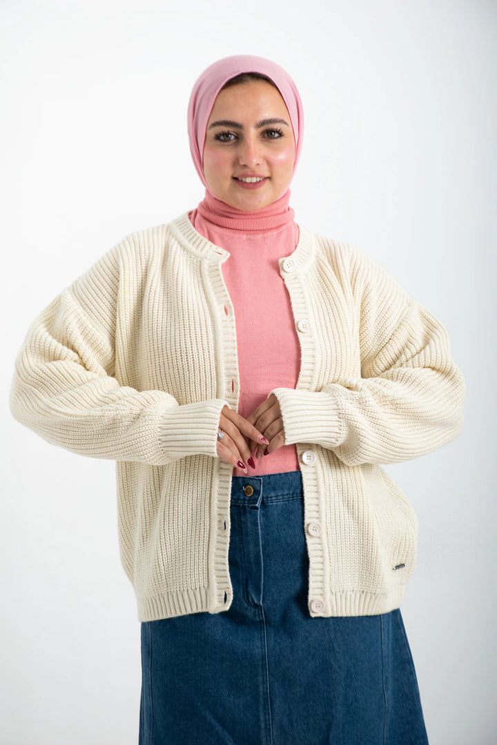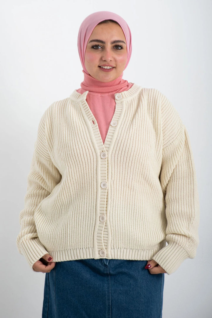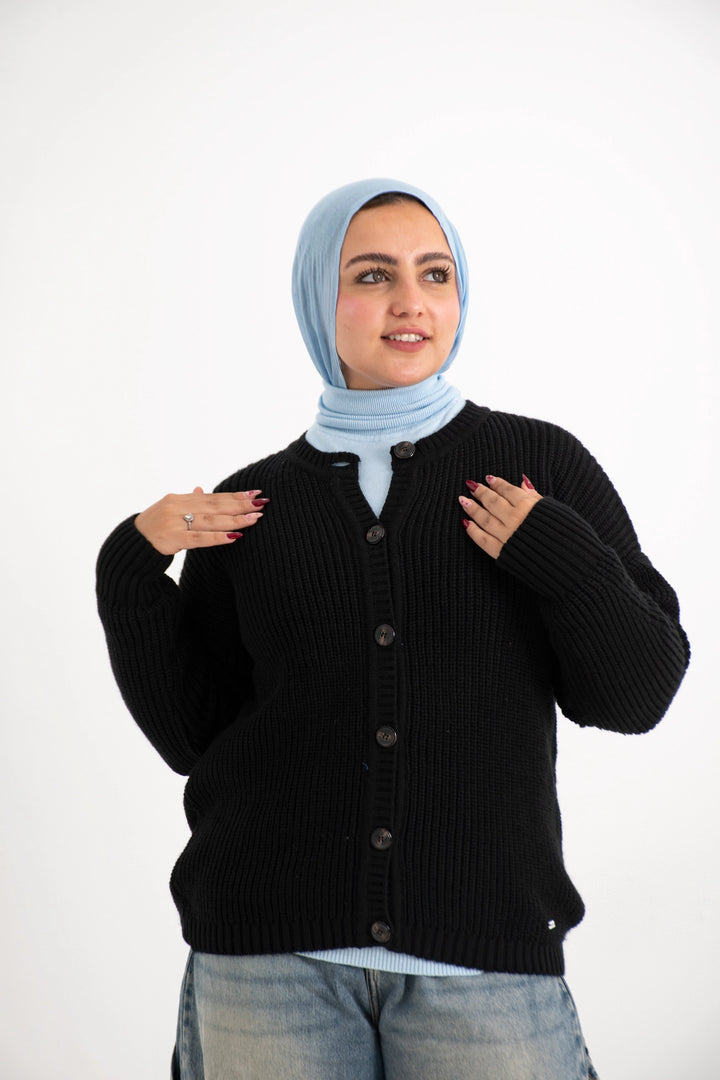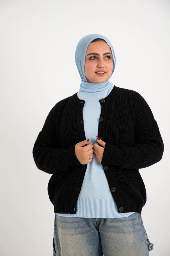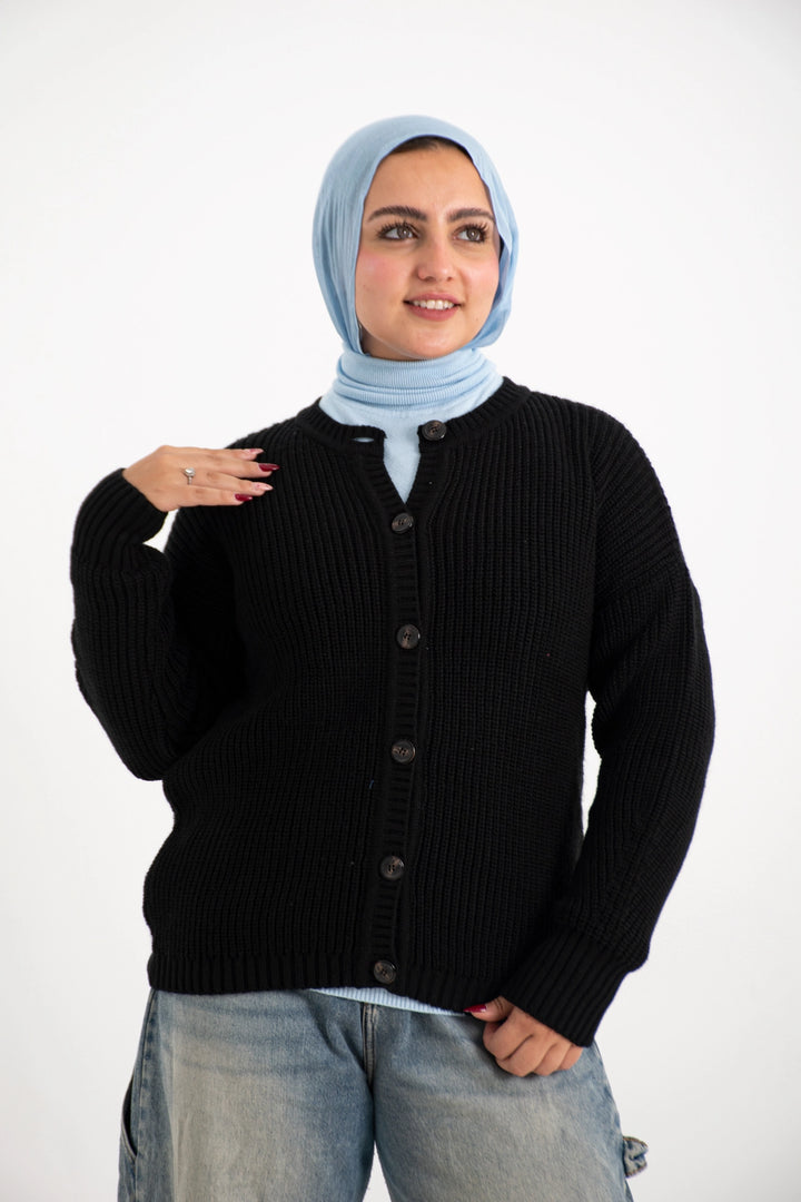 كارديجان تريكو صوف تقيل مضلع مقفول بزراير من نفس اللون لإضفاء لمسه اناقه كلاسيكيه وكتف ساقط لإعطاء وسع وراحه عند اللبس فوق الطبقات